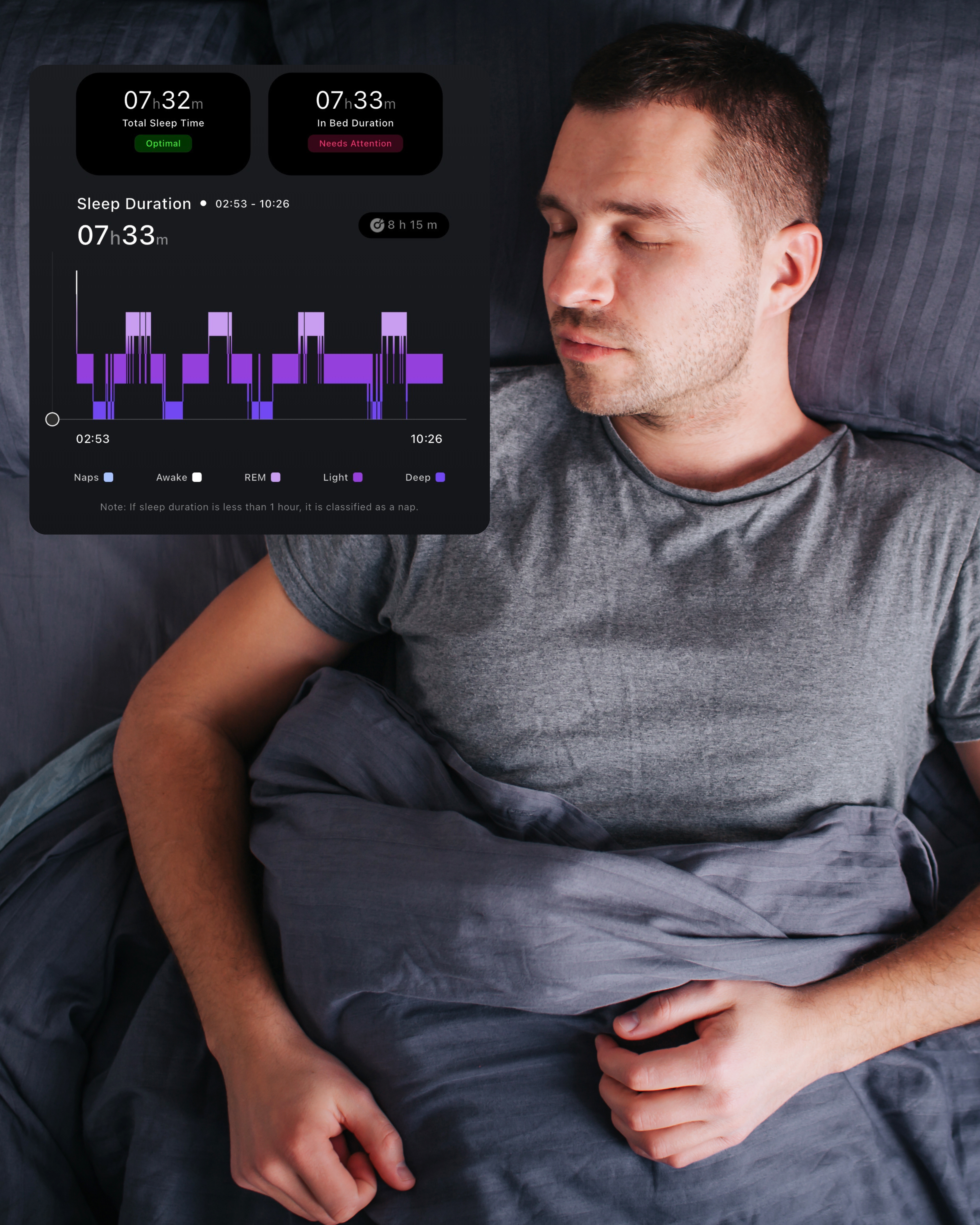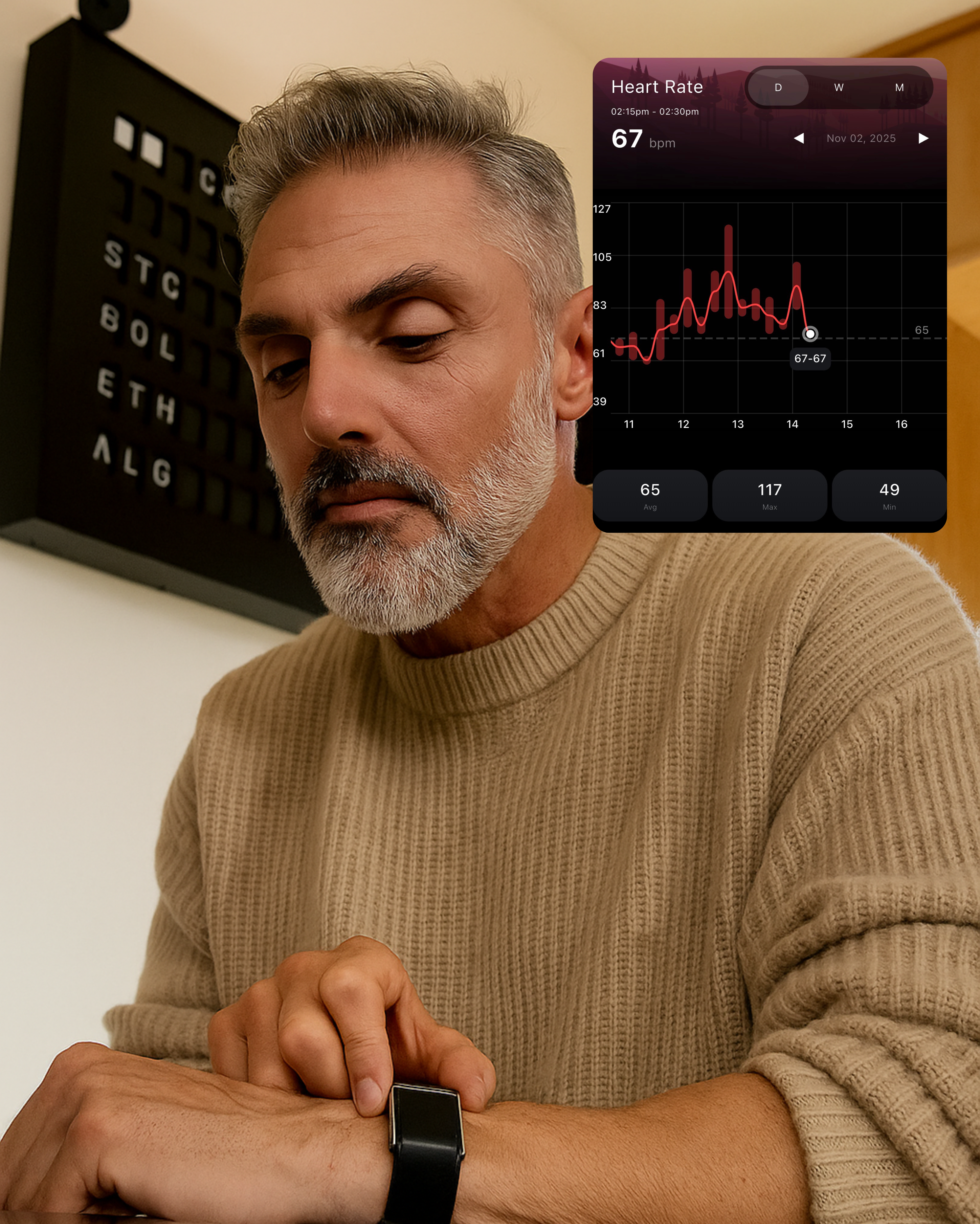 JCvital's artificial intelligence analyzes your metrics as a whole (and not in isolation) to suggest concrete actions to integrate into your daily life: ideal bedtime, time to train, breathing routine, or recommended patch.