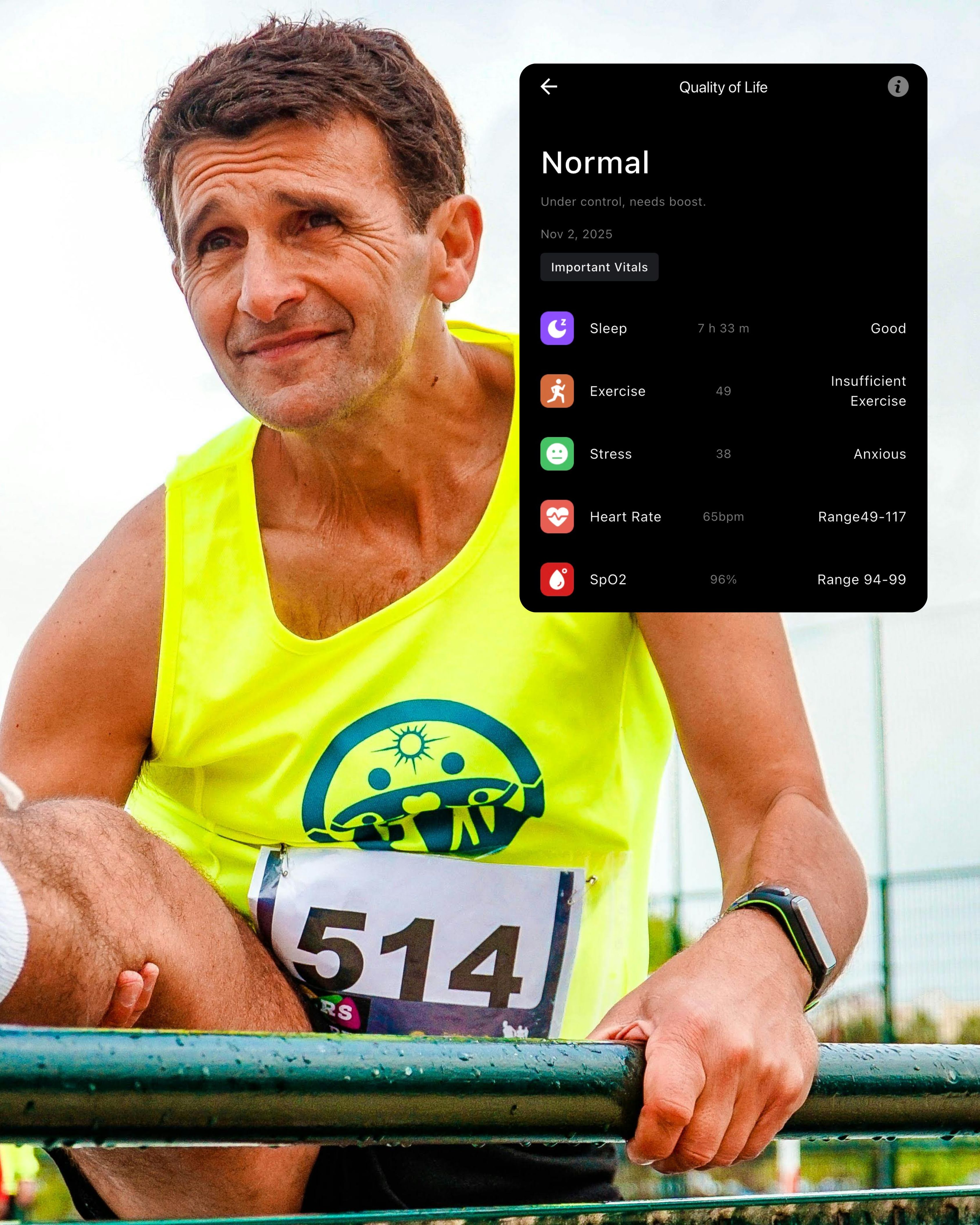 JCvital's artificial intelligence analyzes your metrics as a whole (and not in isolation) to suggest concrete actions to integrate into your daily life: ideal bedtime, time to train, breathing routine, or recommended patch.